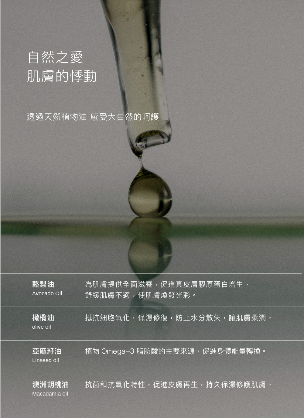 • 七大植物油滋養|橄欖油、摩洛哥堅果油、澳洲胡桃油、酪梨油、亞麻籽油、向日葵油、椰子油,全面潤澤肌膚