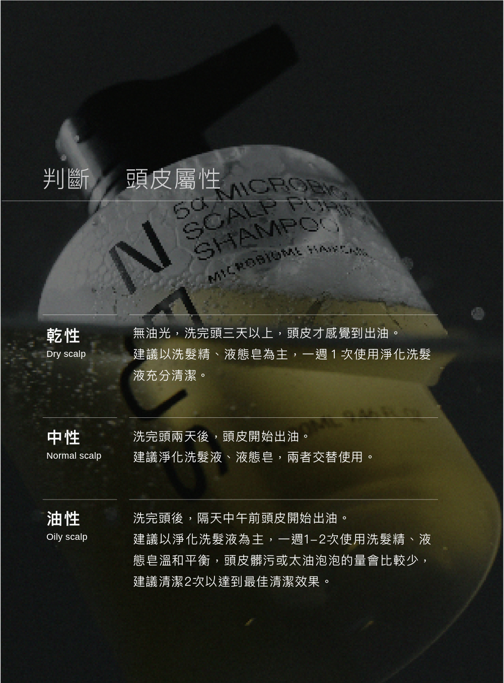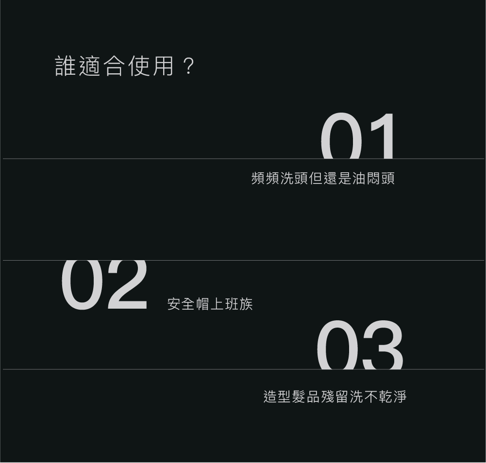 適合:深受油頭、頭癢、頭臭困擾、常帶戴安全帽、重視髮根豐盈的你